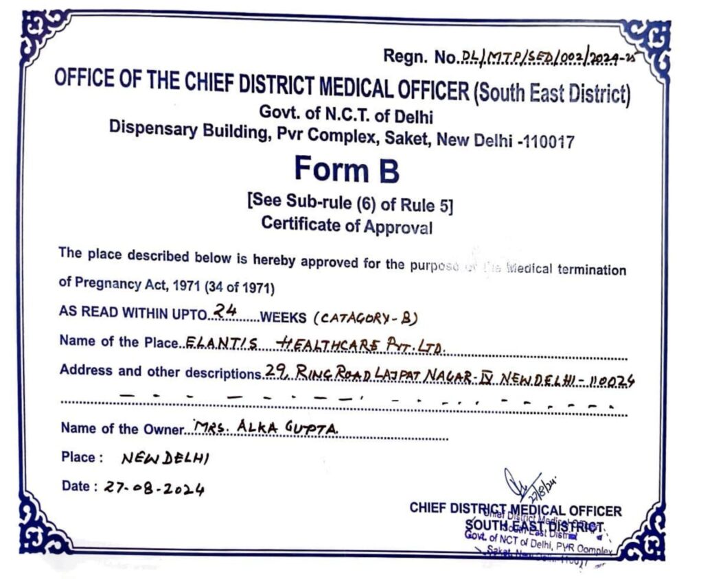 Elantis Healthcare is a Government-Approved Registered Medical Facility in Delhi, providing safe, legal, and confidential medical care for unwanted pregnancies, strictly in accordance with Indian law, for gestational periods up to 24 weeks. All procedures are conducted under the supervision of Dr. Mannan Gupta, ensuring ethical practice, patient safety, and complete privacy.